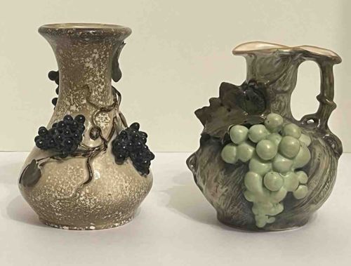 This set consists of two distinct Stellmacher Teplitz ceramic vases, likely dating from the late 19th to early 20th century (circa 1895-1905), showcasing the characteristic Turn-Teplitz Art Nouveau or Jugendstil aesthetic. Both pieces are crafted from high-quality earthenware or 'Turn' porcelain, featuring intricate high-relief applied grape motifs. The vase on the left exhibits a classic shouldered form with a flared rim, decorated with a distinct beige and brown mottled or sponged glaze. It features applied dark purple/black grape clusters and trailing vines with leaves, creating an organic, three-dimensional effect. The vase on the right is a small handled pitcher or ewer shape with a more organic, undulating body. It is decorated with a large cluster of light green grapes and broad dark green leaves against a textured olive and brown background. The handle is modeled to resemble a gnarled vine. The craftsmanship is exemplary of Alfred Stellmacher’s workshop, showing fine detail in the fruit and foliage. Condition-wise, both pieces appear to be in excellent antique condition with no large chips or cracks visible, though such applied elements are notoriously prone to minor losses or flea bites on the leaf edges or stems. A light craquelure in the glaze and some shelf wear on the unglazed bases are consistent with age. This pair represents the pinnacle of Bohemian Art Nouveau ceramics from the Teplitz region, highly collectible for their organic realism and technical difficulty.