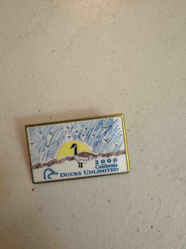 This is a small, rectangular commemorative lapel pin produced for the organization Ducks Unlimited, specifically for the California chapter, dated to the year 2000. Physically, the pin features a gold-toned metal base with an enameled or printed front face protected by a clear coating. The central graphic depicts a Canada goose standing in the foreground, with a large yellow setting sun behind it. The sky is rendered with blue diagonal hatching lines to simulate rain or a textured atmosphere, and a flock of birds is visible in the upper flight path. The lower portion of the pin features the Ducks Unlimited duck head logo in blue, followed by the text '2000 California DUCKS UNLIMITED' in blue serif and sans-serif typography. The construction is typical of mass-produced promotional pins from the late 20th and early 21st centuries, featuring a smooth gold-tone border. Regarding condition, the pin appears to be in good vintage state with no visible chips to the enamel surface or significant oxidization on the metal edges, though minor surface micro-scratching may be present upon close magnification. While no maker's mark is visible on the front, these are often blank or feature simple embossed text on the reverse. This piece serves as a collectible item for conservationists and hunting enthusiasts, marking a specific year of membership or participation in regional wetland conservation efforts.