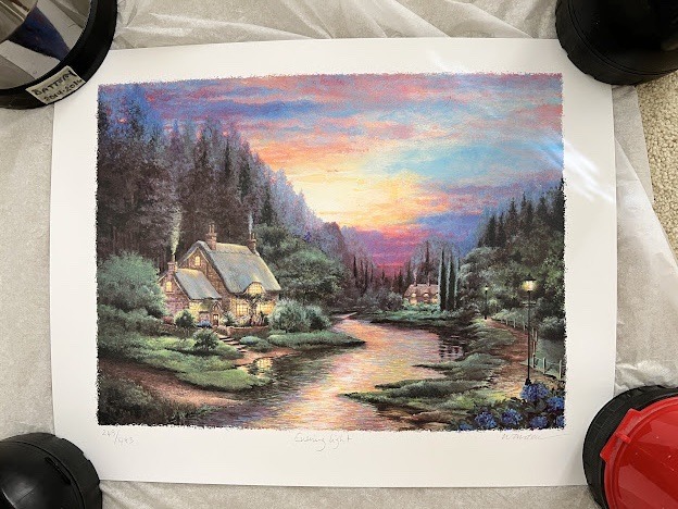 This item is a limited edition lithograph or high-quality art print titled "Evening Light," attributed to the artist Thomas Kinkade. The image depicts a characteristic idyllic landscape featuring a thatched-roof stone cottage nestled beside a winding river at sunset. The color palette is rich and vibrant, showcasing deep purples, oranges, and pinks in the sky, which reflect off the water's surface. Dark, dense evergreen forests frame the background on both sides. The light glows warmly from the cottage windows and lanterns, a signature element of the artist's style. Physically, the artwork is printed on bright white paper with wide margins. In the lower left margin, the piece is hand-numbered '243/493' in pencil. The center margin features the title "Evening Light" in script, and the lower right corner bears a signature 'Thomas Kinkade'. The print appears to be in excellent condition with no visible foxing, creases, or tears on the paper. There are some minor shadows and reflections in the photograph, likely from the protective plastic or the environment, but the art itself looks well-preserved. This style represents Kinkade's late 20th-century 'Painter of Light' romanticism. The numbering suggests a relatively small edition size, which can positively impact its collectibility among Kinkade enthusiasts.