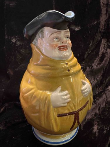 This item is a polychrome glazed ceramic Toby Jug, a type of figurative earthenware vessel fashioned as a seated or standing jovial person. The figure is depicted with a highly characterful, almost grotesque facial expression, featuring wide-set blue eyes, rosy cheeks, and an open-mouthed grin revealing individual teeth. He wears a black tricorn-style hat which serves as the pouring spout of the jug. The body of the figure constitutes the main reservoir, clothed in a mustard-yellow or ochre robe with voluminous sleeves and a dark brown corded belt tied at the waist. His pale hands are positioned on his protruding belly. The piece is mounted on a circular pedestal base highlighted with thin blue concentric rings. Looking at the glossy finish and the style of the mold, this piece likely dates from the late 19th to early 20th century, possibly of English or Continental European origin. The craftsmanship shows attention to detail in the folds of the fabric and the anatomical modeling of the face. Condition appears generally good with a lustrous glaze, though close inspection for fine crazing or a small chip on the rear of the hat's rim is recommended. Such jugs were popularized in the 18th century as novelty drinking vessels used primarily for ale in taverns.