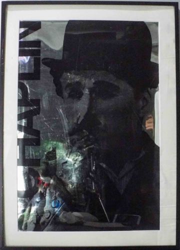 This is an original mixed media artwork featuring a portrait of the iconic silent film star Charlie Chaplin in his 'Little Tramp' persona, complete with his signature bowler hat. The medium is highly unique, appearing to be rendered on a reflective or metallic substrate, possibly Mylar or a silvered foil, which creates an iridescent and high-contrast effect. The composition includes vertical typography on the left side spelling 'CHAPLIN'. The portrait itself is executed with a dark, possibly monochrome ink or paint application that contrasts sharply with the shimmering background. The surface shows significant texture and irregularities, including visible wrinkles, creases, and distressing that add a contemporary, industrial, or street-art aesthetic to the piece. There are also hints of color—notably greens and blues—near the bottom left, suggesting a layered or collage-based technique. The artwork is housed in a simple black frame with a white passe-partout mat. While the artist is unknown, the style conveys a mid-to-late 20th-century or 21st-century contemporary vibe, leaning into Pop Art sensibilities. Notable condition issues include noticeable surface rippling and minor scuffs to the frame, likely intentional to the artist's distressed vision.