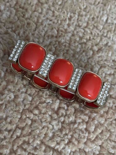 This is a contemporary costume jewelry stretch bracelet featuring a repeating pattern of bold, coral-toned cabochons and pave-set rhinestone spacers. The bracelet is constructed of several silver-tone base metal links held together by internal elastic cords, allowing for a flexible fit. Each primary link features a large, domed, cushion-cut rectangular element with a vibrant reddish-orange enamel or resin finish that mimics the look of Mediterranean coral. These are interspersed with vertical bar-shaped spacers thickly encrusted with two rows of small, clear round-cut rhinestones. The metal exhibits a polished chrome-like finish with minor visible surface scratches and light oxidation consistent with occasional wear. Notably, the 'coral' inserts appear to be glued into their bezels; some excess adhesive residue or minor unevenness in the setting suggests mass-market manufacturing rather than high-end artisan craft. There are no visible maker's marks or hallmarks on the exterior, leaning toward a contemporary 21st-century fashion accessory style. The elastic threading appears intact but shows slight slack, indicating moderate use over time. Overall, the piece maintains its aesthetic appeal with all stones and color inserts present.