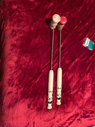 This is a pair of vintage novelty salt and pepper shakers featuring elongated metal rods connecting hand-painted wooden handles to wooden shaker heads. The items appear to be mid-20th-century kitchenware, likely from the 1940s or 1950s. The handles are carved from wood in a cylindrical shape with decorative bulbous ends, featuring hand-painted whimsical facial features that resemble stylized panda or bear characters with large eyes and spectacles. The heads of the shakers are also wooden, with one painted red and the other left in a natural or off-white finish to distinguish between salt and pepper contents. Holes are drilled in the top of each bulbous head for dispensing. The construction consists of a metal rod, likely steel or chrome plating, connecting the two wooden components. The condition shows visible signs of age and patina; there is significant paint loss and chipping on the shaker heads, particularly on the white/natural one, and some fading of the handle illustrations. The metal rods show some dulling or minor surface oxidation consistent with age. There are no clearly visible maker's marks or stamps in the current image orientation, though they are typical of Japanese or American novelty imports from the mid-century era. The craftsmanship is folk-art adjacent, characterized by simple turned-wood shapes and charming if rudimentary hand-applied decoration.