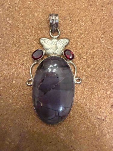 This is a large, hand-crafted decorative pendant featuring a combination of mixed gemstones and silver-toned metalwork. The focal point is a sizeable, vertically-oriented oval cabochon, likely composed of charoite or dyed matrix jasper, displaying a deep purple or violet hue with naturalized internal veining and dark inclusions. Above the central stone sits a molded butterfly motif with detailed wing patterns, flanked by two small, oval-cut faceted red gemstones, possibly garnets or glass, set into bezel mounts. The metal frame extends into two symmetrical scrolling wave-like flourishes on either side of the main body, terminating in small coiled loops. The piece is topped with a heavy, ribbed decorative bail for suspension from a chain. The metal appears to be sterling silver or a high-quality silver alloy, exhibiting a light patina and some tarnishing in the recessed areas of the butterfly and bail. The central stone shows some visible surface reaching fractures or natural fissures characteristic of its mineral type, while the overall construction suggests a late 20th-century bohemian or artisanal style. The craftsmanship is expressive, with hand-applied components and a sturdy, rustic aesthetic typical of independent studio jewelry.