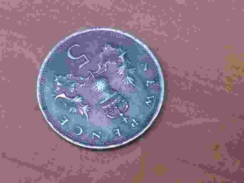 This is a United Kingdom five new pence coin, featuring the reverse design by Christopher Ironside. The design depicts a crowned thistle, the royal badge of Scotland, which is surrounded by the numeral '5' and the inscription 'NEW PENCE'. The coin is circular with a milled edge and is struck in cupro-nickel (75% copper, 25% nickel), giving it a distinct silvery-grey appearance. Based on the 'NEW PENCE' wording, this coin dates from the early decimalization period between 1968 and 1981, as the wording was changed to simply 'FIVE PENCE' in 1982. The image shows significant evidence of circulation, including surface scratches, minor dings on the rim, and a noticeable dark patina or tarnishing across the raised surfaces and flat fields. The strike is standard for circulation currency, with moderate wear visible on the fine details of the crown and thistle leaves. The diameter of this specific issue is 23.59 mm with a weight of 5.65 grams. The orientation in the image is inverted (upside down), but the layout remains clearly identifiable to the Royal Mint's post-decimalization standards. This item is a common specimen of British numismatic history, representing the transition to the decimal system.