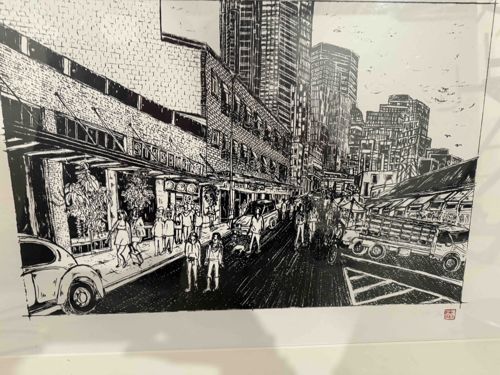 This is a monochrome, black and white artistic print depicting a bustling street scene at Pike Place Market in Seattle. The artwork is characterized by a high-contrast, graphic style reminiscent of a woodcut, linocut, or heavy ink illustration. The composition features a foreground with pedestrians and a vintage Volkswagen Beetle on the left, leading the eye down a crowded street filled with figures, a delivery truck, and iconic storefronts under a 'Public Market' sign. In the background, modern skyscrapers rise above the historic market buildings, indicating a contemporary setting. The execution shows fine hatching and cross-hatching to create depth and texture, particularly in the brickwork and the asphalt. A small red rectangular seal or chop mark is visible in the lower right corner, which is typical of some printmakers' signatures. The piece is matted with a clean white border and appears to be in excellent condition with no visible foxing, staining, or tears. The print is framed behind glass, and the sharp lines suggest a high-quality reproduction or limited edition print on heavy paper stock.