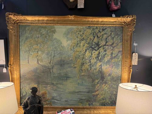 This is a substantial late 19th-century oil on canvas painting depicting a tranquil river landscape. Executed in a Tonalist style, the work utilizes a muted color palette dominated by sage greens, soft ochres, and hazy blues to create an atmospheric, semi-abstracted scene of dense foliage reflected in a still body of water. The brushwork is gestural and impressionistic, suggesting a soft, diffused light typical of dawn or dusk. The painting is housed in an impressive, large-scale Victorian-era gilt wood and gesso frame. The frame features ornate rococo-revival motifs including scrolling acanthus leaves and floral clusters at the corners (cartouches), with a deep cove profile that adds significant visual depth. Physically, the canvas appears well-tensioned, though there is evidence of age-appropriate surface grime and a slight yellowing of the varnish layer which contributes to its antique patina. The frame shows minor cosmetic wear, including small chips in the gesso and light gilding loss, common for its age. The overall craftsmanship suggests a professional academic hand, emphasizing mood and atmosphere over sharp topographical detail. No signature is clearly visible in the provided image, but the quality of the light and reflection indicates a skilled mid-to-late 19th-century landscapist.