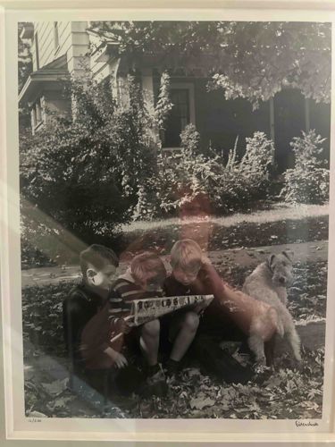 This is a gelatin silver print photography by the renowned photojournalist Alfred Eisenstaedt. The image depicts a nostalgic scene of three young boys sitting outdoors in a leaf-strewn yard, intently focused on reading a newspaper's comic section, accompanied by a small dog (likely a wire-haired terrier). The photograph is a black and white print, notable for Eisenstaedt’s mastery of natural light and candid composition, showcasing mid-20th-century Americana. Physically, the piece appears professionally matted and framed in a white frame behind glass. It is a limited edition work, numbered 12/250 in the lower left margin and hand-signed 'Eisenstaedt' in the lower right margin, which significantly enhances its provenance and market value. The print quality demonstrates exceptional tonal range from deep blacks to crisp whites. The condition is described as excellent, with no visible signs of foxing, yellowing, or silver mirroring. The paper remains flat with no apparent creases or tears. This specific edition likely dates from a later portfolio printing of the artist's classic LIFE magazine era works, maintaining the high craftsmanship standards associated with professional darkroom developments.