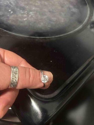 This item is a classic solitaire-style ring, typically associated with engagement or bridal jewelry. The piece features a central, colorless brilliant-cut stone, likely a diamond, cubic zirconia, or moissanite, estimated to be approximately 1.0 to 1.5 carats in size. The stone is held in place by a traditional four-prong setting, ensuring maximum light exposure for brilliance. The band is a slender, polished shank made of a white-toned metal, which could be 14k/18k white gold, platinum, or sterling silver. The overall construction follows a minimalist, modern aesthetic characterized by clean lines and a high-polish finish. No visible maker's marks or metal fineness stamps are identifiable from the image orientation, but the setting appears professionally crafted. Condition-wise, the ring shows minor surface wear consistent with light use, with no major deformation to the band or visible chipping to the stone's crown. The design is timeless and reflective of contemporary jewelry standards of the late 20th to 21st century. The clarity of the stone appears high under ambient lighting, though further magnification would be required to assess internal inclusions or specific color grading.