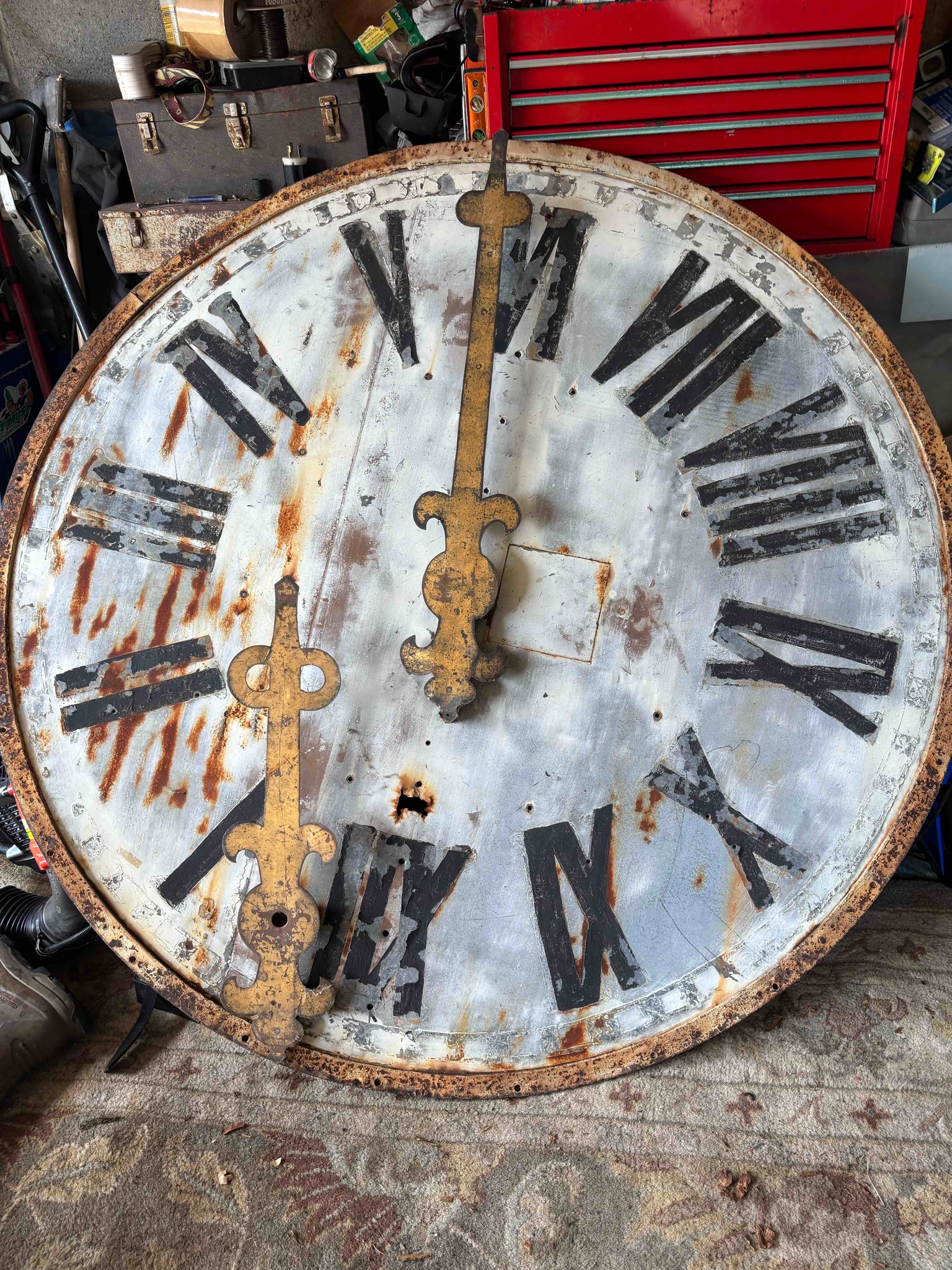 This is a significant oversized industrial clock face, likely salvaged from a tower, church, or railway station. It is constructed from a heavy circular metal sheet, finished with a weathered white/off-white enamel or paint. The face features prominent oversized Roman numerals hand-painted in black, which exhibit significant flaking and losses. The clock includes two large, ornate fleur-de-lis styled hands, currently detached or misaligned, which appear to be made of gold-toned or brass-plated metal. Physically, the item shows extensive signs of age and exposure; heavy rust and oxidation are present around the entire perimeter rim and bleeding into the face from various mounting holes and scratches. There is a notable square patch or repair plate visible in the center area, and a puncture hole is located near the six o'clock position. The overall craftsmanship suggests a late 19th to early 20th-century origin, designed for long-distance visibility. The heavy gauge of the metal and the scale of the hands indicate high-quality industrial fabrication intended for outdoor architectural integration. The patina is authentic and deep, characteristic of decades of environmental exposure.