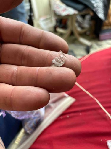 The item is a small, irregular fragment of a translucent material, potentially clear glass, plastic, or a natural mineral such as quartz. Based on its scale relative to the human finger, it measures approximately 0.5 to 1 centimeter in length. The material appears colorless with a high degree of transparency, though it features internal striations and surface textures that suggest it resulted from a fracture. The edges are sharp and jagged, exhibiting conchoidal fracturing typical of amorphous solids like glass or certain crystalline structures. There are no visible maker's marks, signatures, or decorative elements, as this appears to be a secondary byproduct or a piece of debris rather than a finished object. The condition is characterized as damaged or broken, with significant surface irregularities and lack of structural uniformity. It lacks any identifiable style or period, as its form is entirely accidental. Due to its size and state, it possesses no decorative or functional craftsmanship value in its current condition, appearing most likely to be a discarded shard from a larger vessel or component. The clarity is relatively high, and there is no visible patina, though minor surface dirt or oil from handling is present.