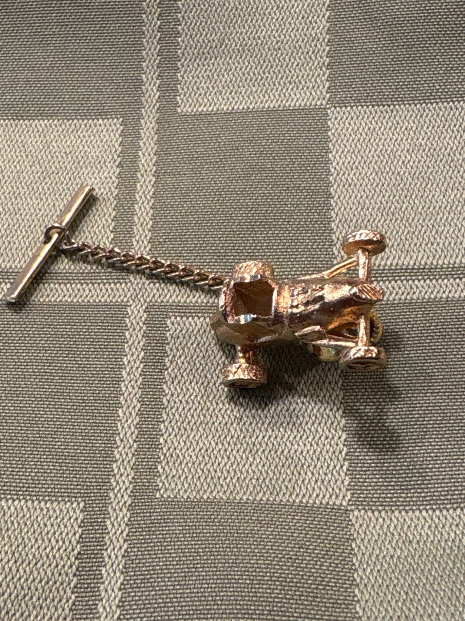Vintage Gold-Tone Race Car Tie Tack with Security Chain