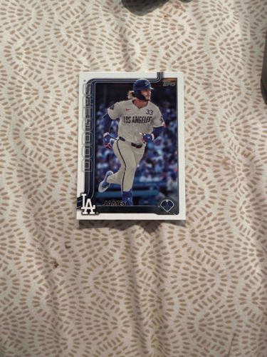 This is a 2023 Topps Series 1 baseball card featuring James Outman of the Los Angeles Dodgers. The card measures approximately 2.5 by 3.5 inches and is constructed from standard semi-glossy paper stock with a white border. The design reflects the 2023 Topps flagship aesthetic, characterized by a curved 'wave' border element on the left side that encases the team name 'DODGERS' in vertical blue lettering. The central image shows Outman in his grey away uniform running the bases. The Topps logo is located in the upper right corner, while the Los Angeles Dodgers 'LA' logo and the player's last name 'JAMES' are situated along the bottom edge. Physically, the card appears to have relatively sharp corners and clean edges, though the top-to-bottom centering seems slightly shifted towards the bottom. There are no immediate signs of surface creasing or significant corner rounding visible in the image, suggesting a well-preserved condition typical of recent modern issues. The card is a standard base 'Rookie Card' (RC), lacking serial numbering or special refractive foils, which indicates it is part of the high-volume base set production.