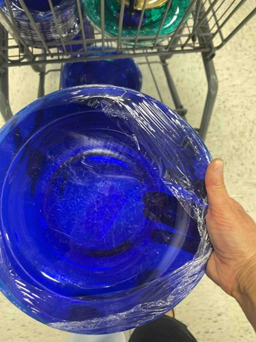This is a circular centerpiece or serving bowl crafted from heavy, translucent glass. The primary color is a deep, rich cobalt blue that appears consistent throughout the body of the vessel. A notable design feature is the thick, clear glass rim that provides a contrasting border to the high-saturation blue interior. The bowl exhibits a broad, shallow profile with a wide diameter, held in a hand for scale, suggesting a width of approximately 10 to 12 inches. Currently, the item is partially wrapped in plastic stretch film, likely for protection during transport or sale, which creates some surface distortion in the photograph. Underneath the plastic, the glass appears smooth with a high-gloss finish. While no specific maker's marks are visible through the covering, the weight and thickness of the glass suggest a mid-to-late 20th-century origins, possibly in the style of Murano or professional art glass mid-century modern pieces. The craftsmanship shows quality in the seamless transition between the blue body and the clear rim. Condition-wise, it appears intact without major chips, though a thorough inspection for surface scratches or 'flea bites' would require removal of the plastic wrap. The saturation of the blue suggests it was achieved through the addition of cobalt salts during the glass-making process.