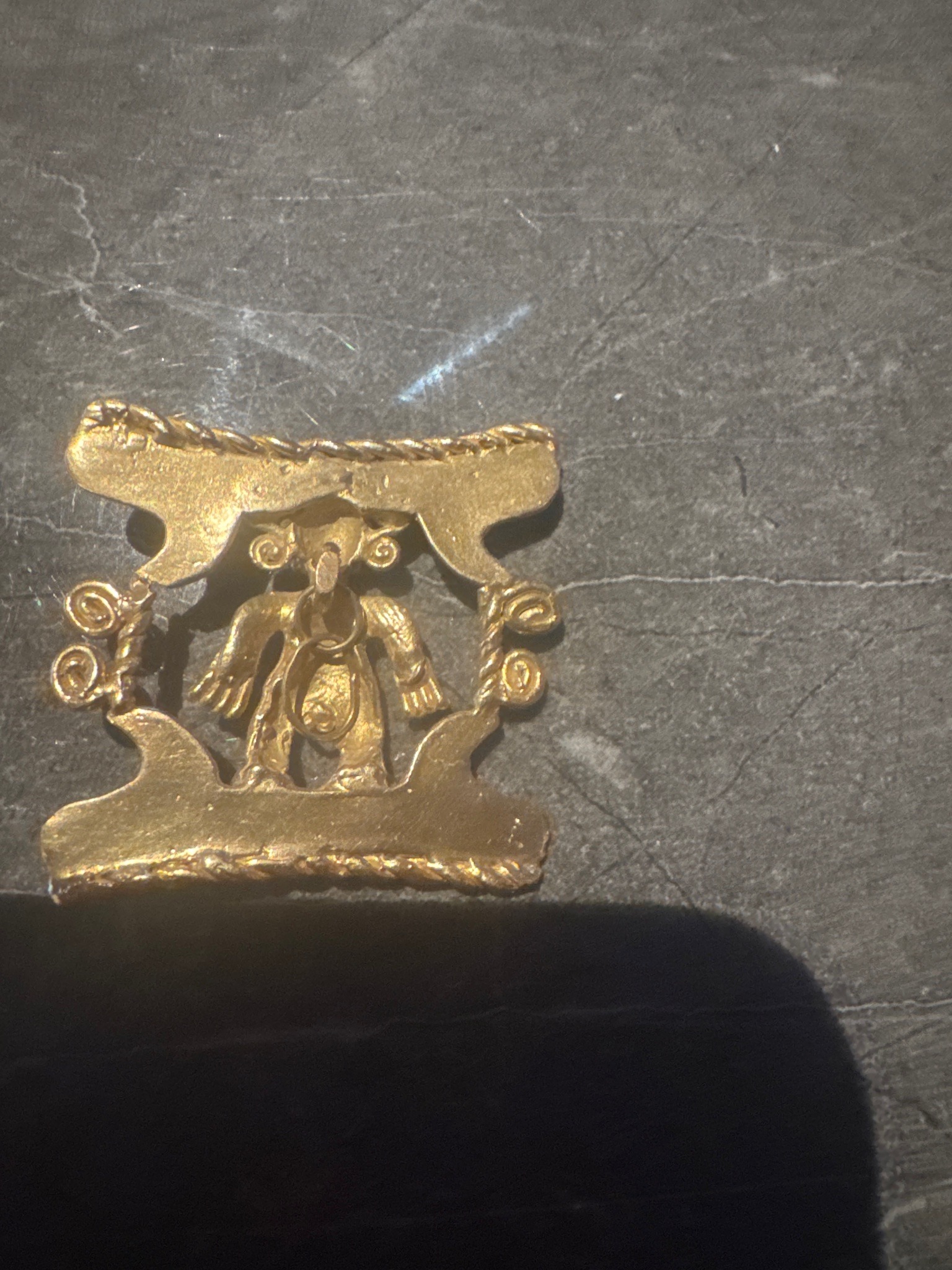 This item is a decorative yellow-gold-toned pendant, measuring approximately 1.5 to 2 inches in width, crafted in a style reminiscent of Pre-Columbian goldsmithing from Central or South America (such as the Diquis or Malagana cultures). The piece features a central anthropomorphic figure with stylized bird-like or simian features, characterized by large spiral ears or headdress elements and outstretched hands. The figure is enclosed within a rectangular frame defined by top and bottom flat bars with braided 'rope' borders. Flanking the central figure are symmetrical wirework spirals. A distinctive ring is suspended from the figure's nose or mouth area, suggesting a labret or nose ornament. The material appears to be either a high-karat gold wash or a tumbaga alloy (gold and copper), displaying a rich, slightly matte yellow luster. The construction shows signs of lost-wax casting, indicated by the integrated decorative spirals and textured surfaces. Condition-wise, the item exhibits minor surface abrasions, soft edge wear, and a gentle patina consistent with a 20th-century reproduction or a well-preserved ethnographic artifact. There are no visible maker's marks or hallmarks on the front surface.