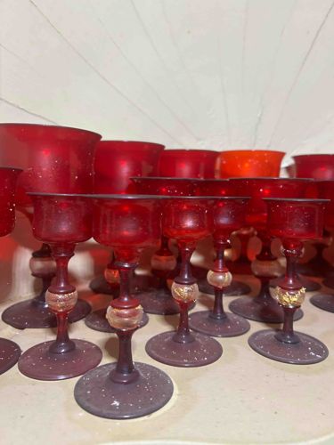 This is a large collection of hand-blown art glass candle holders and vessels, likely originating from Italy in the Murano style. The set consists of multiple sizes, including smaller taper-style holders and larger votive or hurricane vessels. The primary color is a rich, translucent ruby red with a matte, frosted finish that gives the glass a velvety texture. A distinguishing feature is the ornate stem work on the smaller holders, which includes a clear or yellowish glass adventurine bulb infused with gold leaf or gold flecks, sandwiched between dark, almost black-red glass turnings. The construction is delicate, featuring a tulip-shaped cup, a slender baluster stem with an ornamental knop, and a wide, flat circular base. The frosting appears somewhat uneven in places, and there is visible surface dust and white speckling that could be either intentional grit within the glass or environmental debris that needs cleaning. One vessel in the background appears to be an orange-red hue, suggesting a possible gradient or variety within the set. Based on the gold-flake knop and stem design, these pieces are likely mid-to-late 20th-century decorative items, demonstrating high craftsmanship in glass manipulation and finishing.