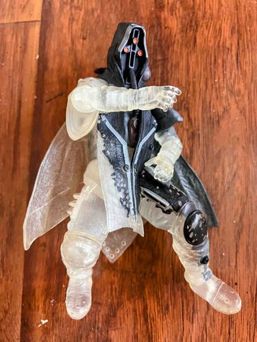 This is a 7-inch scale articulated action figure representing the Hunter class from the video game Destiny 2, specifically depicted in a translucent 'spectral' state. The figure is constructed primarily from a combination of clear and semi-opaque plastics, mimicking the in-game 'void' invisibility effect. It features a dark grey or black hooded cowl with distinctive orange eye-sensor markings on a mechanical faceplate and a flexible hose connecting the mask to the chest piece. The armor showcases intricate sculptural details including textured fabric patterns on the cloak, ribbed segments on the limbs, and reinforced knee pads. The paint application is unique, utilizing a 'fading' effect where solid black/grey paint transition into clear plastic. Condition-wise, the figure shows some surface dust and minor scuffing on the clear plastic components, which is common for this material. The joints appear to be standard ball-and-socket or hinge construction typical of McFarlane's 2017-2019 production era. The sculpt displays high-quality craftsmanship in the mechanical and textile textures, though the clear plastic composition can sometimes hide these fine details compared to fully painted variants.