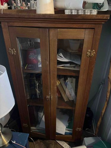 This item is a vintage-style standing display cabinet, commonly used for books or collectibles. Measuring approximately 4 to 5 feet in height, it is constructed from solid wood, likely oak or a similar hardwood, featuring a medium-toned brown honey finish that highlights the natural grain. The cabinet consists of two vertical glass-paneled doors that provide visibility to three internal wooden shelves. The design incorporates a molded cornice at the top and a simple base. Notable decorative elements include four ornate brass-toned butterfly or wing-shaped hinges (two on each outer side) and a central brass-toned latch or handle mechanism at the meeting point of the doors. This style suggests a mid-20th-century American production, potentially reflecting a late Colonial Revival or traditional aesthetic. Regarding its condition, there is visible surface wear including scratches, minor scuffing along the vertical door frames, and some finish degradation particularly near the base and corners. The glass appears intact without visible cracks. The interior shows varied content, indicating typical household use. No maker's marks or signatures are strictly visible from the front view, but the joinery and hardware suggest a mass-produced consumer piece rather than a custom bespoke build.
