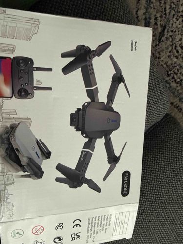 This is an E88 Pro foldable quadcopter drone, presented in its original retail packaging. The device is primarily constructed of lightweight black and grey plastic, designed for compact portability with folding motor arms. The box art depicts the drone in flight, a collapsed view, and a remote controller utilizing a smartphone for a display. Notable features include a front-facing camera for FPV (First Person View), four-propeller propulsion, and a contemporary aerodynamic chassis design. The packaging specifies a '14+ Ages' rating and displays regulatory markings such as CE, UKCA, and FCC, indicating compliance with international electronics standards. The manufacturing text on the box identifies the model as E88, with a 3.7V 1800mAh battery and a manufacturing date of 2024.08, confirming its brand-new status. The item appears to be in pristine, unused condition with no visible damage to the retail box, though as an entry-level consumer electronic device, it is characterized by mass-produced plastic components rather than premium aircraft-grade materials. The box also highlights the foldable nature of the drone, which is a hallmark of current 'mini' drone styling.
