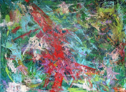 This original work is an abstract expressionist acrylic painting on a 16" x 20" canvas. The composition is characterized by a high-energy, gestural application of paint, utilizing impasto techniques and visible palette knife work to create a rich, tactile surface. The palette is dominated by a central, diagonal slash of vibrant crimson red that cuts across a complex background of teal, forest green, and cerulean blue. Secondary accents of lilac, pale yellow, and stark white are interspersed throughout, creating a frantic yet rhythmic sense of movement. The layering of colors suggests depth and a multi-staged creation process, where older layers peek through newer scrapings. The construction appears sound, with the pigment well-adhered to the textile support. There are no immediate signs of cracking (craquelure), flaking, or significant atmospheric damage, suggesting a contemporary or modern era of production. The edges of the canvas appear to show continued paint application, indicating it may be intended for display with or without a floating frame. The quality of craftsmanship is evidenced by the deliberate balance of chaos and structure, as well as the sophisticated color blending that avoids muddying despite the heavy overlay of contrasting tones. No specific artist signature is visible on the front surface in this view, though it likely exists on the reverse or is integrated into the textured lower corners.