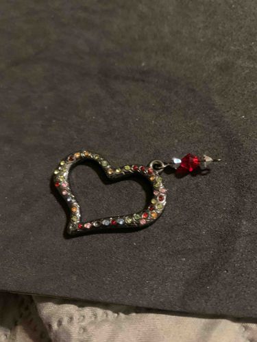 This item is an open-work heart-shaped charm or pendant, crafted from a dark, gunmetal-toned base metal. The front face of the heart is pavé-set with a multicolored array of small round rhinestones, including shades of red, pink, yellow, blue, and green. The heart has a slightly irregular, 'sketch-style' silhouette, giving it a modern, whimsical aesthetic. Attached to the side of the heart via a jump ring is a small dangle composed of a silver-toned metal pin threaded with three multifaceted crystal beads: a central ruby-red bicone bead flanked by two clear or iridescent bicone beads. The item shows signs of light wear consistent with use in costume jewelry, including potential minor tarnishing on the metal and superficial scratches. Based on its design and materials, it is likely a mass-market fashion accessory from the early 21st century (circa 2000-2015). No visible maker's marks or hallmarks are present in the image, suggesting it is a commercial-grade piece rather than fine jewelry. The craftsmanship is standard for production-line costume pieces, using glued-in stones and base-metal findings.
