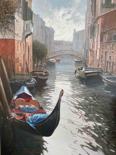 This is an original oil painting on canvas depicting a classic Venetian canal scene. The composition features a prominent gondola in the lower left foreground, tied to wooden mooring posts, leading the viewer's eye down a receding waterway lined with multi-story Italianate buildings in shades of terracotta, ochre, and warm grey. Numerous other boats and gondolas are moored along the channel, which culminates in a small arched bridge in the hazy distance. The artist employs a realistic yet slightly impressionistic style, with significant attention to the rippling reflections in the water and the play of sunlight against the weathered stone facades. The light appears to be mid-day or late afternoon, as indicated by the soft shadows and the hazy, luminous sky filled with textured clouds. A signature in red is visible in the bottom left corner, likely identifying the contemporary artist. The craftsmanship is high, showing skilled use of perspective and color blending to create atmospheric depth. The condition appears excellent with no visible tears, crazing, or significant paint loss, though minor surface dust may be present. The style suggests a late 20th to early 21st-century production, typical of high-quality representational European cityscapes.