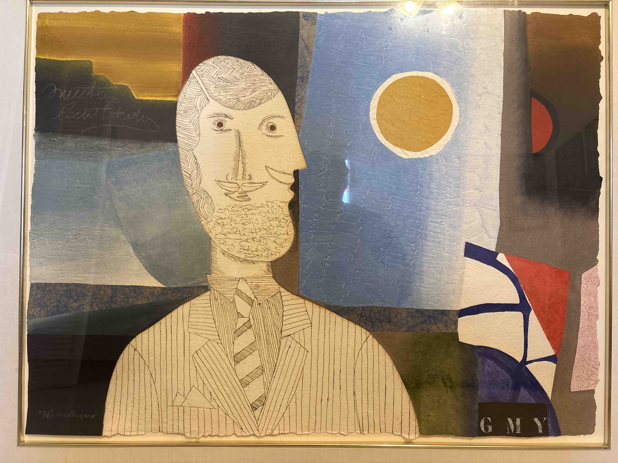 This is a sophisticated mixed-media artwork, likely a carborundum engraving with collage and embossing elements, by the French artist Max Papart (1911–1994). The central figure is a stylized, cubist-influenced man in profile, wearing a pinstriped suit and tie. The figure's head is meticulously detailed with fine pen-like etchings that form hair texture and a beard comprised of script-like markings. The background is a complex arrangement of textured paper, vibrant color blocks (including golds, blues, and deep reds), and a prominent yellow circular form reminiscent of the sun. Notably, the paper features deckled or hand-torn edges, particularly visible at the bottom of the figure's bust, giving it a three-dimensional, sculptural quality. In the lower-left corner, the work is numbered '55/60' and hand-signed 'Max Papart'. The upper-left corner contains faint, cursive script that may read 'Mister Lawrence'. The piece displays high craftsmanship through its layering techniques and tonal variety. It appears to be in excellent contemporary condition, housed within a simple gold-tone frame with a protective plexiglass or glass covering, showing no signs of fading, moisture damage, or significant foxing.