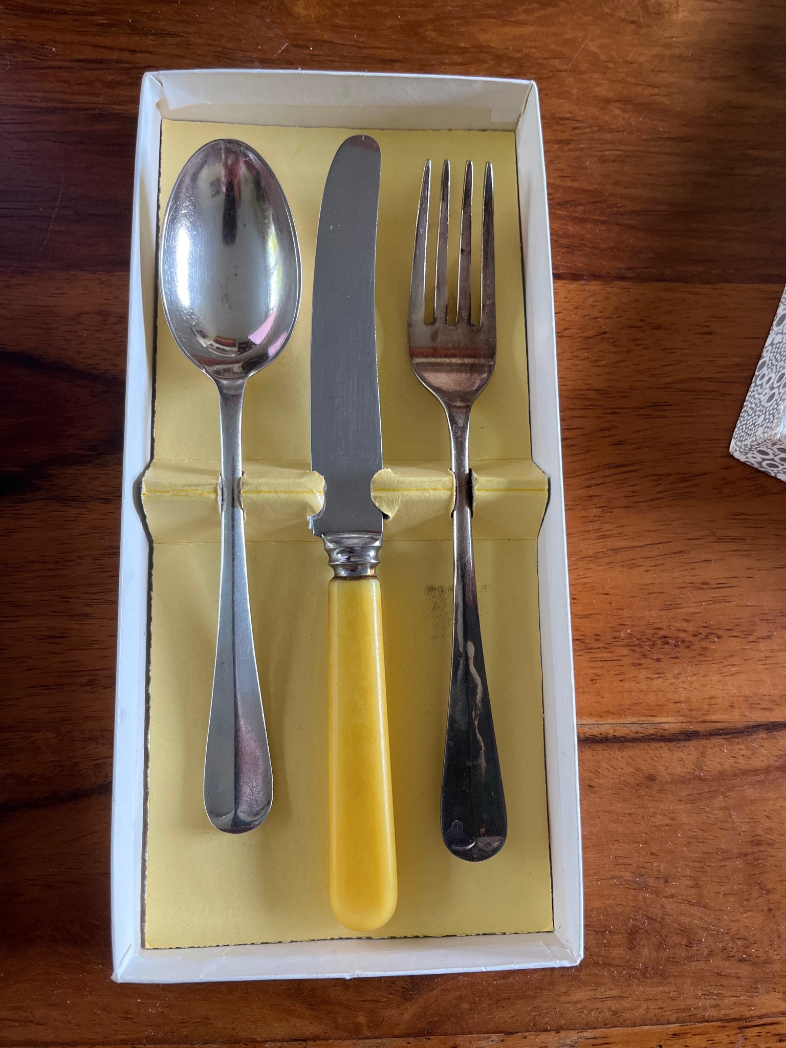 This is a vintage three-piece individual cutlery service set, comprising a spoon, a fork, and a knife, presented in a fitted yellow-lined presentation box. The spoon and fork feature a classic 'Old English' pattern design, characterized by elegant, unadorned rounded stems and flared terminal ends. The knife is constructed with a rounded-tip stainless steel blade joined to a distinctive yellow composite handle, likely early plastic such as Bakelite or Ivorine, featuring a ribbed silver bolster. Based on the uniform design and the context of hallmarked silver, these pieces likely date to the early to mid-20th century, approximately 1920-1940. The fork and spoon exhibit a dark grayish patina, indicating tarnish consistent with silver content, while the knife handle shows a smooth, buttery yellow finish. The set appears in used condition; the fork shows significant surface oxidation and some spotting on the tines, and the spoon displays fine micro-scratching on the bowl from use. The presentation box, featuring a simple white exterior and a folded yellow cardboard insert, shows minor edge wear and light staining behind the fork, suggesting it is original to the period.