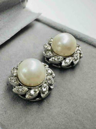 14k White Gold Pearl and Diamond Cluster Clip-On Earrings