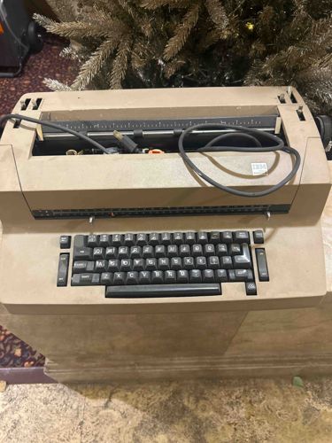This is an IBM Selectric II electric typewriter, a landmark of 20th-century office technology. The unit features a textured plastic housing in a beige or light tan color, common for business equipment of the 1970s and 80s. Its key characteristic is the 'golf ball' IBM Selectric type element hidden within, which rotates and tilts to strike the ribbon. The keyboard is black with white lettering, showing a standard QWERTY layout with additional functional keys like 'Back Space', 'Exp', and 'Return'. A small IBM logo is visible in the upper right-hand corner. The machine's condition appears moderately worn with visible surface dust and some grime accumulation, particularly in the crevices of the keyboard. There are signs of aging in the plastic housing, potentially including minor scratches and slight discoloration. The power cord is draped across the top, showing some stiffness and age. This model, likely manufactured between 1971 and 1984, represents a shift towards fast, precise business typing prior to the dominance of personal computers. The heavy metal internal frame indicates robust craftsmanship and durability.