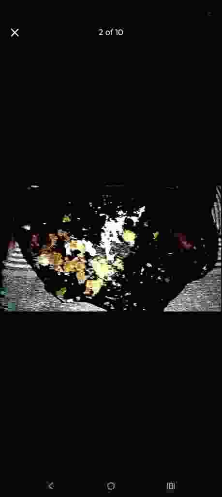 This item is an irregular, hand-blown art glass bowl that displays a dark, primarily black or midnight blue primary body with vibrant internal inclusions. The piece features a 'millefiori' or 'confetti' style technique where flecks of yellow, orange, red, and green glass are suspended within the matrix. The physical form is organic and asymmetrical, characteristic of mid-century modern or contemporary studio glass movements. Due to the high level of digital noise and compression in the image, fine details such as specific maker's marks or signatures cannot be identified; however, the irregular rim and thickness suggest a handcrafted process rather than mass production. The surface reflects a high-gloss finish, typical of polished glass. Visible within the center is a bright white highlight, likely a reflection of an overhead light source, which helps define the concave interior. There are no obvious cracks or large chips visible through the visual interference, but the overall lack of clarity makes a precise condition assessment difficult. The style is reminiscent of 20th-century Murano glass from Italy or West Virginia glass schools, emphasizing bold color contrasts and fluid silhouettes. The craftsmanship appears significant given the complexity of the interior glass patterning.