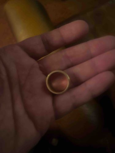 This item is a circular band ring, appearing to be crafted from yellow gold. Based on its visual characteristics, it possesses a substantial width, often referred to as a cigar or pipe-cut band. The ring features a sleek, high-polish finish on its uniform exterior, with a well-defined, flat profile. The interior of the band is visible, showing a slightly convex or 'comfort-fit' inner curvature that improves wearability. The color is a consistent, warm yellow typical of 14k or 18k gold alloy. Regarding condition, the metal displays a soft satin-like patina consistent with gentle use, with minor surface scuffs and micro-scratches visible under close inspection. No significant dents, deep gouges, or resizing seams are apparent from this angle. The craftsmanship appears high, with precise edges and a symmetrical form, indicating machine-turning followed by hand-polishing. While makers' marks or fineness stamps are not visible in the current orientation (likely hidden on the inner shank), the item's timeless, minimalist style suggests it could range from late 20th-century vintage to contemporary production. It lacks ornate engraving or stone settings, emphasizing the purity of the metal material.