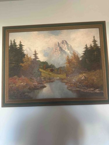 This mid-20th-century German landscape painting is an oil on canvas depicting a classic Alpine vista. The composition features a central towering snow-capped mountain peak looming over a verdant valley containing a rustic mountain hut and a tranquil stream or pond in the foreground. The color palette is dominated by earthy greens, autumnal ochres, and cool blues, with white and gray impasto utilized to highlight the rugged mountain faces. The execution shows mid-range craftsmanship characteristic of the Post-War German school of landscape painting, focusing on atmospheric naturalism. The canvas is housed in a decorative period-appropriate dark wood frame with a gilded bead-and-reel inner molding and a secondary gold pinstripe border. While the specific artist signature is obscured in this view, the style is reminiscent of regional painters who catered to the domestic and tourist markets in Bavaria or the Black Forest during the 1940s and 1950s. The condition appears stable, though there is general surface grime and a yellowing of the varnish consistent with its age before 1960. No major tears or losses are visible, though minor edge wear relates to the frame fit. The overall aesthetic value is derived from its nostalgic portrayal of the European wilderness and its authentic mid-century construction.
