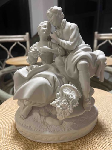 This item is a white bisque (unglazed) porcelain figurine depicting a romantic 'gallant' couple in 18th-century Rococo-style attire. The sculpture features a seated man leaning over a woman who holds a flower, set upon a naturalistic grassy base with an overflowing basket of roses at their feet. The piece is characterized by a matte, satiny finish typical of high-quality bisque ware, which allows for the fine details of the drapery, facial expressions, and delicate floral petals to remain crisp without the softening effect of a thick glaze. The base is circular with a decorative molded border. Structurally, the figurine displays high-level craftsmanship, seen in the dynamic folds of the clothing and the intricate construction of the rose petals. While no specific maker's mark is visible from this angle, the style is reminiscent of European makers like Sèvres, Meissen, or Capodimonte, though many 20th-century reproductions exist. It appears to be in excellent condition with no visible cracks, chips, or major repairs, although the porous nature of bisque porcelain means it is susceptible to dust accumulation and surface marking over time. The piece likely dates from the late 19th century to the mid-20th century as a revivalist decorative object.