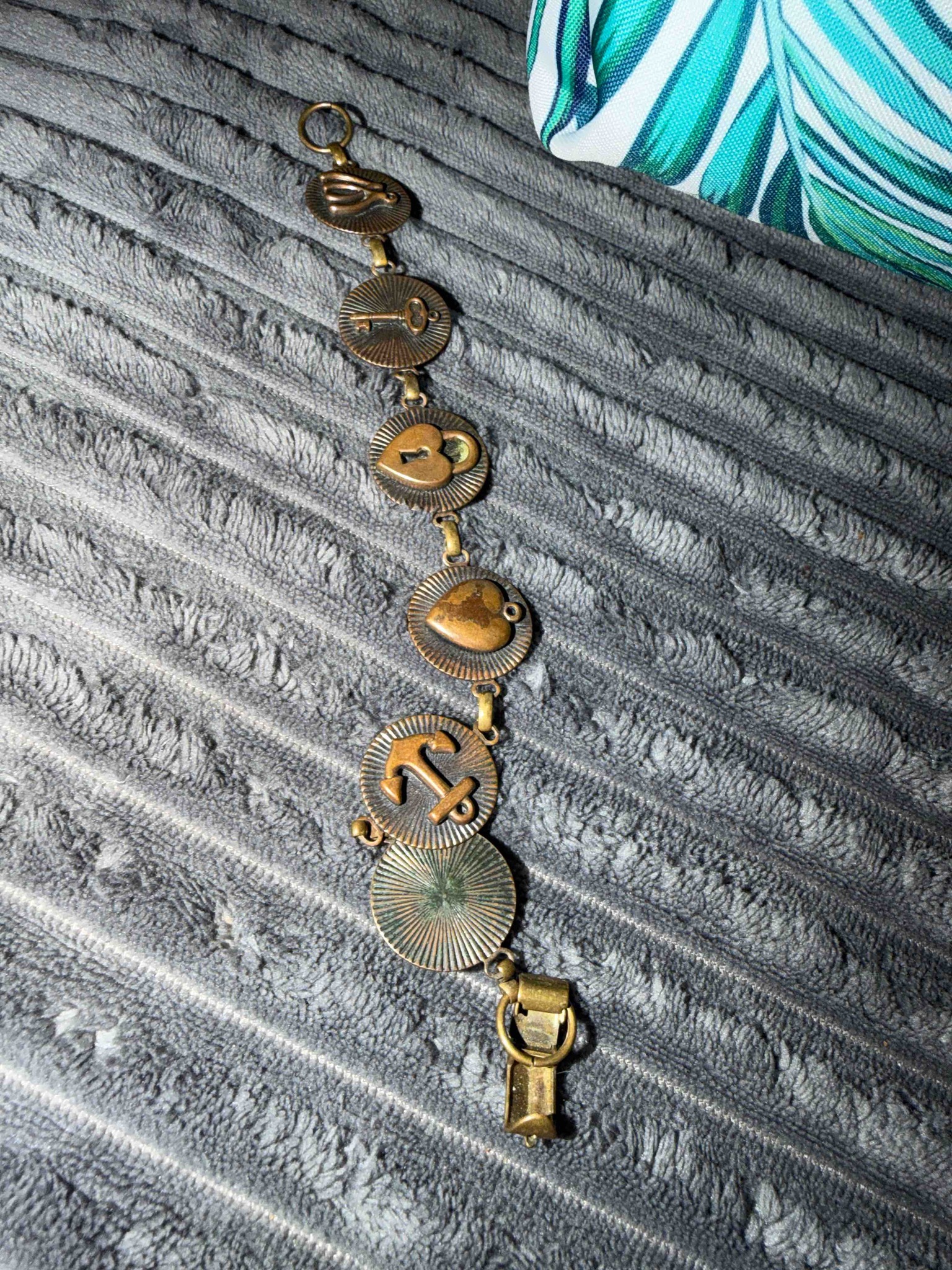 Vintage Brass Charm Bracelet with Nautical and Romantic Motifs