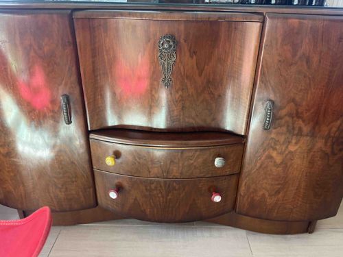 This is a mid-20th-century Art Deco style cocktail cabinet or sideboard, characterized by its distinctive curved front and rich book-matched walnut veneers. The piece features a central flip-top or fall-front drink compartment adorned with an ornate, vertically oriented cast metal escutcheon plate, likely made of brass or bronze with a dark patina. Below the central cabinet are two bowed drawers, which currently feature mismatched, non-original replacement knobs in various colors (yellow, white, and red), indicating a loss of original hardware. Flanking the center are two large curved cupboard doors with matching vertical metal handles. The wood shows a warm, medium-brown finish with a high-gloss sheen, emphasizing the dramatic grain patterns typical of the 1930s-1940s era. Regarding condition, there are visible surface scratches, minor indentations, and what appears to be some localized finish wear or light reflections on the left and center panels. The base is a continuous plinth style, consistent with late Deco and Streamline Moderne furniture design. The overall craftsmanship suggests a mass-produced but high-quality domestic piece from the post-depression era, likely British or American in origin.