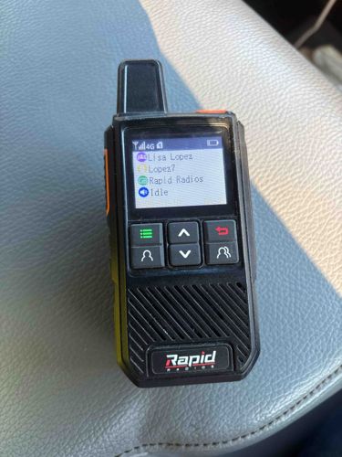 This is a modern portable communication device identified as a Rapid Radios walkie talkie. The unit features a ruggedized black polycarbonate housing with textured sides for enhanced grip and distinctive orange accent buttons on the side. It utilizes a digital color LCD display that is currently active, showing a cellular signal strength indicator, 4G connectivity, battery level, and a contact list with names such as 'Lisa Lopez'. The device includes a front-facing speaker grille with a diagonal slat design and the 'Rapid Radios' logo printed at the bottom. Control is managed through a physical six-button keypad featuring icons for menu, back, up/down arrows, and individual/group talk modes. A short, fixed stubby antenna is located at the top left. The construction suggests a focus on durability for commercial or outdoor use. The condition appears to be excellent with minor surface dust and no significant scratches or impact damage visible on the screen or casing. As a PoC device, it differentiates itself from traditional RF radios by utilizing nationwide cellular networks for unlimited range communication.