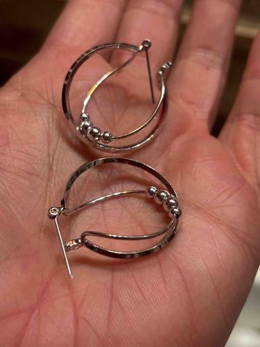 This is a pair of contemporary-style hoop earrings crafted from a polished white metal, likely sterling silver or a high-quality silver-toned alloy. Each earring features a dual-band open hoop design with a distinct hammered texture on the exterior surface, which creates faceted reflections of light. The construction is unique in its asymmetrical, sculptural fluid form, where one band overlaps the other. Three small, polished spheres are stationed along the inner band as decorative accents. The earrings utilize a traditional post and butterfly-back (or tension) closure system. The posts appear straight and intact. The metal exhibits a bright, high-shine finish with minimal visible oxidation or patina, suggesting a relatively modern age, likely late 20th or early 21st century. No clear maker's marks or hallmarks are visible in the provided image. The overall condition appears to be very good with no significant scratches, dents, or signs of metal fatigue visible in the bands or joints, reflecting standard quality commercial craftsmanship.