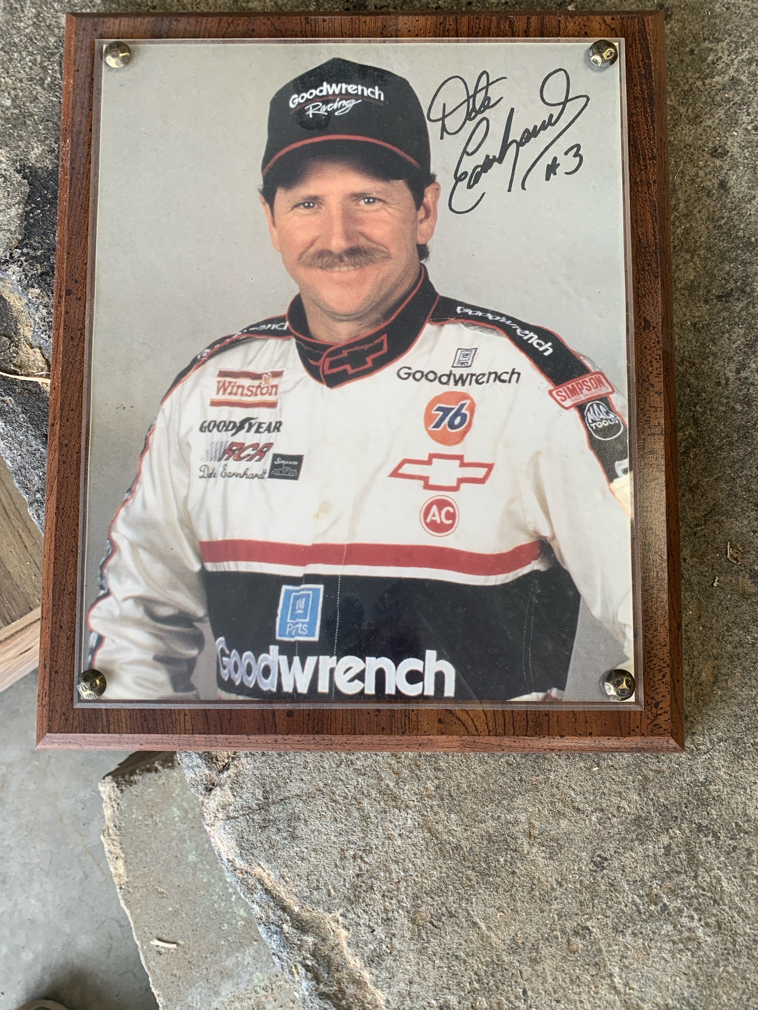 This item is a commemorative sports memorabilia plaque featuring a portrait of the legendary NASCAR driver Dale Earnhardt Sr. The piece consists of a full-color glossy photograph mounted on a dark wood-grain finished plaque, likely MDF with a veneer. The photograph depicts Earnhardt in his iconic white, black, and red Goodwrench racing suit and matching sponsors' cap. A bold black ink signature, accompanied by his famous number '#3', is located in the upper right quadrant of the image. The photo is secured to the wooden base by a clear acrylic or plexiglass cover, held in place by four decorative brass-toned rosettes or screw caps at each corner. The plaque features beveled edges, providing a professional display finish. Based on the uniform branding—including Goodwrench, Winston Cup, and Chevrolet—the image dates to the mid-to-late 1990s. The signature appears consistent with known authentic examples of Earnhardt's hand, though professional authentication would be required for a formal valuation. The condition shows minor wear on the wooden edges and light surface dust, but the image remains vibrant without visible fading or moisture damage. The craftsmanship is typical of high-quality mass-produced fan collectibles from the late 20th century.