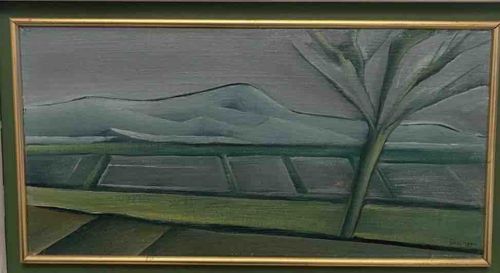 This original oil painting on canvas, titled "Dunas," is a modernist landscape work created by the renowned Brazilian artist Carlos Bracher in 1975. The composition features a somber and atmospheric color palette dominated by muted greys, sage greens, and earth tones. In the foreground, a stylized, leafless tree stands at a slight angle on the right side, its branches reaching upward in a simplified, fan-like gesture. The mid-ground is defined by horizontal bands of green fields partitioned by dark outlines, leading to the eponymous rolling dunes in the background. These dunes are rendered with smooth, rhythmic curves that mimic the contours of a reclining human form, a common trope in modernist landscape art. The sky is a flat, cloudy grey, providing no direct light source and emphasizing the pensive mood. The paint application appears controlled yet expressive, with visible impasto and brushstroke textures that add depth to the flat planes of color. The artist's signature and the date '1975' are visible in the lower right corner. The work is housed in a contemporary thin gold-toned wooden lath frame within a larger green-painted outer frame. The canvas appears to be in good condition with no visible signs of cracking, flaking, or repair, showing only light surface patina consistent with its age of nearly five decades. The craftsmanship reflects Bracher’s transition toward his more signature expressionistic style, characterized by strong emotional resonance and structural simplification.