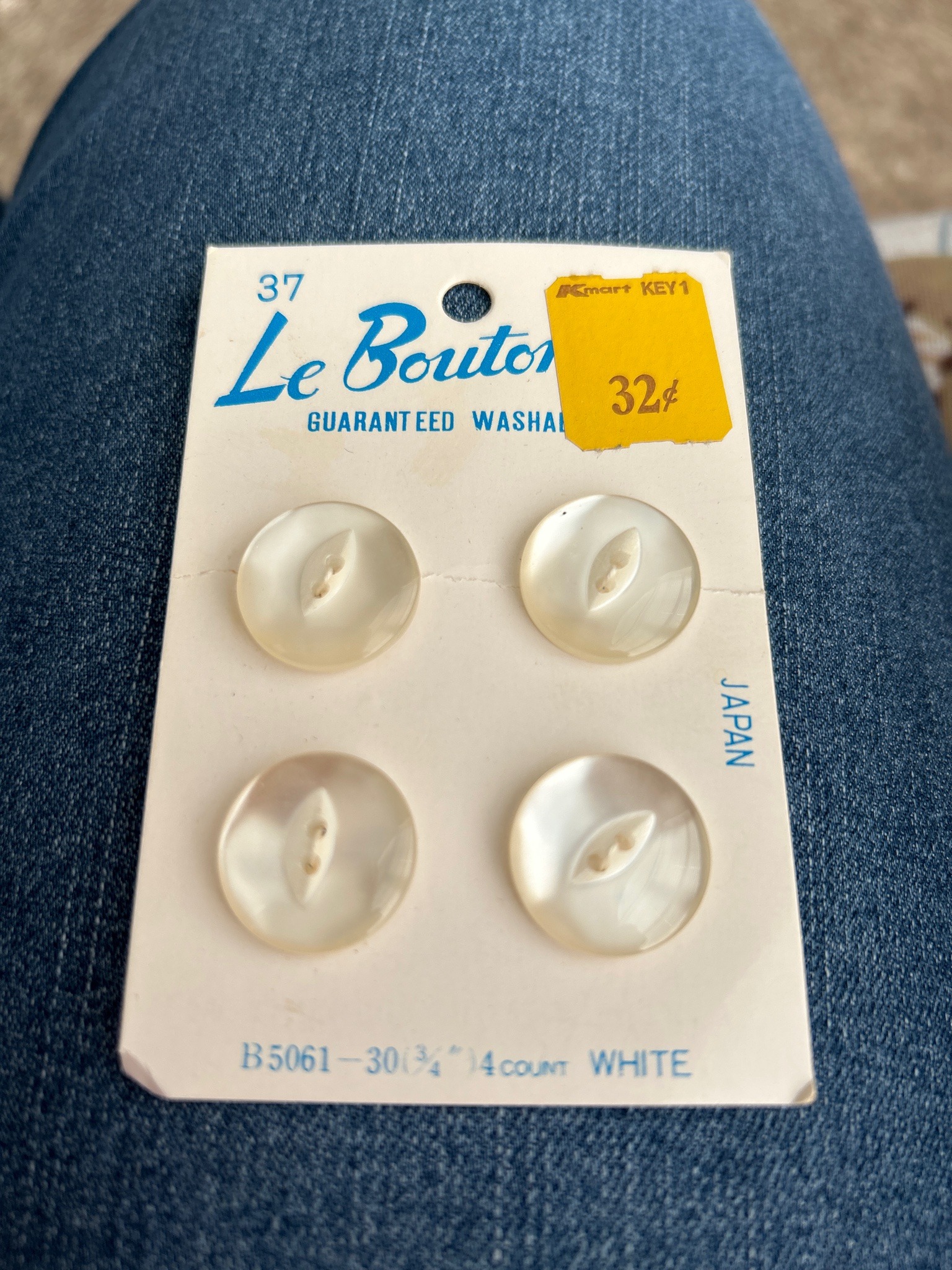 This item consists of a set of four vintage sewing buttons presented on their original retail card. The buttons are circular with a diameter of 3/4 inch, featuring a classic white iridescent finish that mimics genuine mother of pearl or high-quality nacre. Each button is designed with a distinctive raised, marquise-shaped (eye-shaped) center containing two sewing holes. The buttons appear to be made of a polished synthetic resin or plastic, typical of mid-20th-century 'washable' notions. The packaging is a white rectangular card with blue typography, featuring the brand name 'Le Bouton' and 'Guaranteed Washable'. A notable secondary feature is the original bright yellow 'Kmart KEY 1' price sticker, marking the set at 32 cents, which serves as a significant chronological indicator. The card is marked 'JAPAN', denoting the origin of manufacture. Regarding condition, the buttons themselves appear pristine and unused. The card shows signs of age-related wear, including minor creasing, a central horizontal fold line, slight yellowing or foxing near the top, and some blunted corners. The typography and price point suggest this item dates from the late 1960s to the 1970s. This is a well-preserved piece of vintage haberdashery and retail history, maintaining its original point-of-sale configuration.