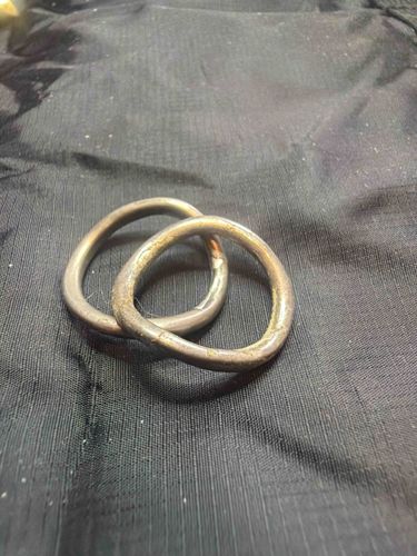 This item comprises two interlinked circular bangles featuring a distinct organic, undulating, and non-uniform shape. The rings exhibit a thick, rounded profile throughout their circumference. The material appears to be a heavy metal, likely silver-plated brass or a similar alloy, given the visible surface wear. The color is a tarnished metallic silver with significant golden-brown brassy undertones peering through the areas of friction and high contact, particularly on the outer edges. The surface shows a high level of patina and light pitting, suggesting considerable age or frequent use. There are no visible maker's marks or hallmarks in the provided image, though the style is reminiscent of mid-20th-century modernist jewelry or contemporary artisanal craft. The construction is solid with no visible seams, indicating a possible casting process. The condition is fair to good, with the primary aesthetic value derived from the heavy oxidation and the 'distressed' look of the metal. The fluid, wave-like geometry provides a tactile and sculptural quality characteristic of the organic modernism movement.