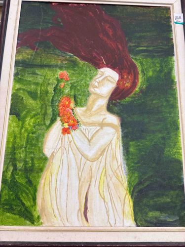 This is an original painting, likely oil or acrylic on canvas, depicting a woman with flowing reddish-brown hair against a vibrant green background. The subject is shown from the waist up, wearing a light-colored, draped gown and holding a gathering of orange and red flowers. Her face is stylized with minimalist features, eyes closed, suggesting a tranquil or dreamlike state. The composition uses a vertical format and is housed in a multi-layered frame consisting of an inner off-white linen-style mat and a dark wood outer frame. Physically, the artwork exhibits visible brushstrokes and a textured surface consistent with hand-painted application. There are noticeable condition issues, including a prominent vertical crease or crack running through the upper left quadrant of the canvas and several small surface white spots or paint losses near the bottom left edge. No visible artist signature is discernable in the image, but a retail price tag is present on the top right corner of the frame, indicating it may be a secondary market find. The style is mid-to-late 20th-century expressionism, characterized by bold colors and emotional rather than literal representation. The craftsmanship appears to be that of an amateur or emerging artist, given the simplified anatomical proportions and flat plane of the background.