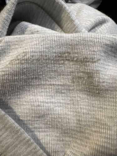 This item is a vintage-style long-sleeved thermal baselayer or crewneck shirt, crafted from a heather gray cotton-blend rib-knit fabric. The construction features a vertical 1x1 or 2x2 ribbing throughout, which provides significant elasticity and form-fitting comfort, typical of outdoor performance wear from the late 20th century. The most distinguishing feature is the faded heat-press or screen-printed brand logo located on the interior back neck area, showing the cursive 'Eddie Bauer' script signature. Below the logo, faint remnants of sizing and care instructions are visible, including a 'MADE IN' indication that is difficult to decipher but suggests a production era between the 1990s and early 2000s. The garment shows clear signs of heavy use and age, including significant pilling (bobbling) across the fabric surface, localized yellowing or sweat staining near the neckline, and general fading of the internal stamp. The stitching around the collar exhibits a reinforced overlock or coverstitch, indicating durable construction intended for active outdoor use. The material appears to be a mid-weight blend, likely cotton mixed with polyester or spandex to maintain shape. Despite the visible wear and surface degradation, the garment maintains structural integrity without obvious holes or catastrophic seam failures.