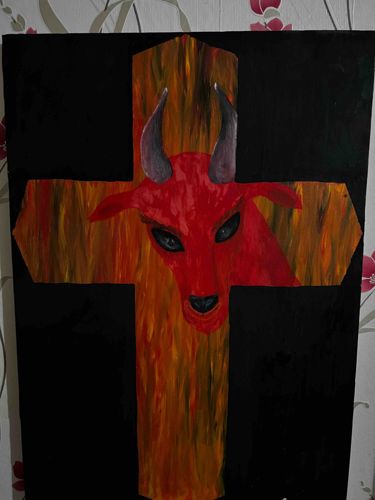 This is an original hand-painted artwork on a flat rectangular support, likely canvas board or paper, utilizing what appears to be acrylic or heavy-bodied gouache paint. The central motif features a Latin cross shape filled with vertical, expressive brushstrokes in shades of orange, yellow, and brown, evoking a wood-grain or fire-like texture. Centered within the cross is a stylized, bright red demonic or goat-like figure with dark, almond-shaped eyes, pointed ears, and two large grey horns that extend beyond the upper boundary of the cross. The negative space surounding the cross is painted in a solid, matte black, resulting in a high-contrast visual. The craftsmanship displays a raw, outsider art or amateur quality, characterized by visible, non-blended brushwork and bold color application. From an appraisal standpoint, there are no visible artist signatures or date marks on the front surface. The edges of the support appear potentially uneven, suggesting it may be a student work or a piece of contemporary folk art. The condition looks generally stable with some minor surface imperfections and texture variation typical of hand-applied paint, and a small white artifact or minor loss is visible at the bottom edge of the black field.