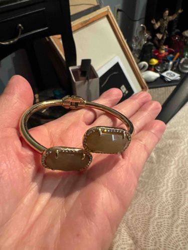 This is a fashionable jewelry piece known as the Elton Pinch Cuff by contemporary designer Kendra Scott. The bracelet features an adjustable gold-tone metal band with a high-polish finish and a sleek, tubular construction. Its most prominent features are the two signature oval-shaped stations at the open ends, which are set with translucent, faceted stones in a neutral champagne or light brown hue, possibly Cat's Eye glass or a similar synthetic quartz. Each stone is secured by four stylized prongs and surrounded by a delicate halo of small, clear pave crystals that add reflective sparkle. The bracelet includes a functional hinge at the center of the band for ease of wear, which appears to be in good working condition. The craftsmanship reflects the brand's 'Boho-Chic' aesthetic popular throughout the 2010s to the present. The gold plating shows light surface scratches and minor dulling consistent with gentle use, but no significant pitting or metal loss is visible. The stones appear secure in their settings without noticeable chips or cracks.