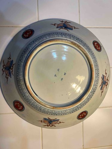 This item is a significant large-scale porcelain charger, likely originating from Japan and executed in the Imari or Sometsuke-style tradition featuring overglaze enamels. The reverse of the platter displays a light celadon-blue tinted glaze characteristic of historical porcelain production. It is decorated with a band of hand-painted floral or butterfly-like motifs in cobalt blue and iron-red enamels, interspersed with circular medallions containing stylized red clouds or phoenixes. Around the foot rim is a continuous decorative border of overlapping petals or ruyi-heads in underglaze blue. The central underside features four distinct blue marks that may represent spurs or kiln marks. The foot rim shows an unglazed, slightly oxidized orange-brown paste, indicating its ceramic body. The craftsmanship suggests a 19th-century or early 20th-century production, typical of the Meiji or early Taisho periods. Condition-wise, the piece appears structurally sound but exhibits minor surface soot, faint crazing, and general shelf wear on the foot rim, consistent with age. The scale and complexity of the enamel work indicate a high level of decorative quality intended for display or ceremonial use.