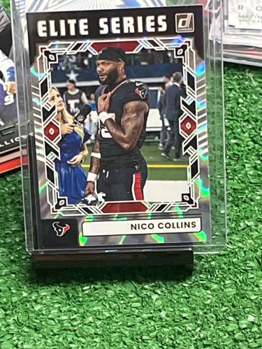 This is a 2023 Panini Donruss football card featuring Houston Texans wide receiver Nico Collins from the 'Elite Series' insert set. The card features a standard 2.5-by-3.5-inch rectangular construction on cardstock with a holographic or 'prizm' foil finish that creates a rainbow reflective effect when hit by light. The design includes a bold 'ELITE SERIES' header at the top with a stylized geometric border surrounding a central action photograph of Collins. The bottom of the card displays the Houston Texans team logo and Collins' name in a white text box. The Panini 'Donruss' brand logo is visible in the upper right corner. The card appears to be in excellent condition, housed in a protective top-loader and interior soft sleeve to prevent surface scratching or corner wear. The centering looks relatively balanced, and the surface shows the high-quality glossy finish typical of Panini's modern chrome-style inserts. No visible creases, whitening on edges, or major surface defects are discernible from the image. This piece represents a modern era sports collectible from a popular flagship NFL product line.