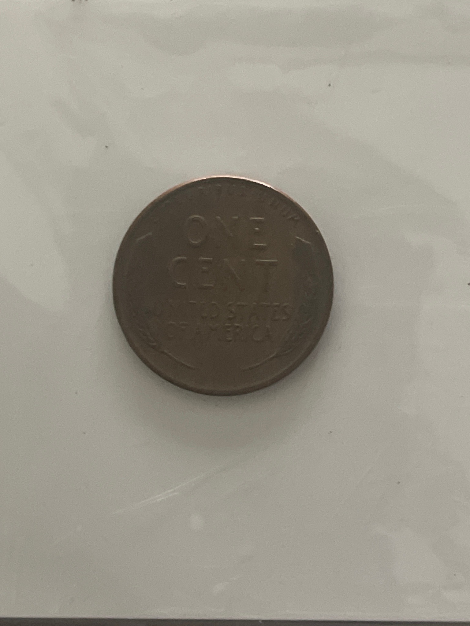 This is the reverse side of a United States one-cent coin, commonly known as a Wheat Cent, which was minted between 1909 and 1958. The design features the central denomination 'ONE CENT' in a bold, sans-serif typeface, with 'UNITED STATES OF AMERICA' inscribed below it. Flanking the central text are two stylized stalks of wheat, which give the coin its popular name. The motto 'E PLURIBUS UNUM' is visible along the top rim. The coin displays a significant dark brown patina, typical of aged copper or bronze composition (95% copper, 5% tin/zinc), though the user context interestingly mentions '1 ounce silver,' which would indicate a modern bullion round or a novelty oversized replica rather than a standard circulating coin, as authentic period Wheat Cents were small and copper-based. The condition shows moderate wear; the lettering and wheat stalks remain legible, but there is noticeable smoothing and a lack of original luster. There is a small indentation or rim ding visible on the upper left edge and surface spotting throughout. The overall appearance is consistent with a circulated coin from the mid-20th century, though its materiality should be verified against the silver claim.