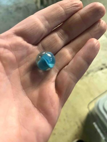 This is a machine-made vintage glass marble, specifically identifying as a 'cat's eye' variety due to the central vane of color. The item is approximately 5/8 of an inch (16mm) in diameter, which is a standard player size. It features a clear glass base with a suspended internal structure consisting of three to four distinct vanes in shades of turquoise and sky blue. The blue glass interior has a characteristic twisted or ribbon-like appearance common in machine-made marbles from the mid-20th century, likely dating between the 1950s and 1970s. Regarding condition, the surface shows minor pocket wear, including several very small subsurface moons and tiny fleabites or nicks consistent with age and active play. There are no large chips or major fractures visible, though the glass exhibits a slight dulling of the original high-gloss factory polish. The craftsmanship is typical of high-volume American or Japanese manufacturers like Vitro Agate or Marble King, defined by the clean separation between the clear casing and the colored core. There are no visible maker's marks, as is standard for this type of collectible, though the vane configuration and color palette are significant indicators of its era and origin.